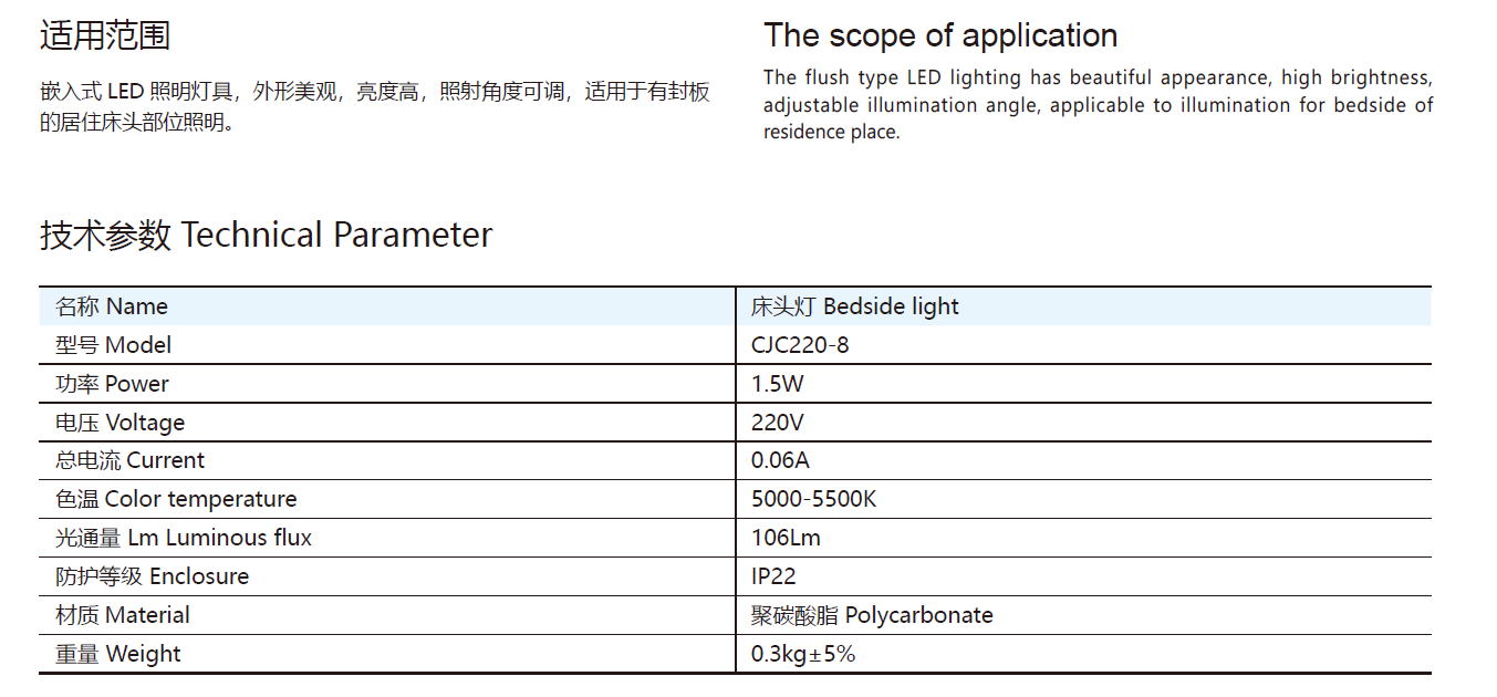 LED Polycarbonate Bedside Light 220V 1.5W | CJC220-8