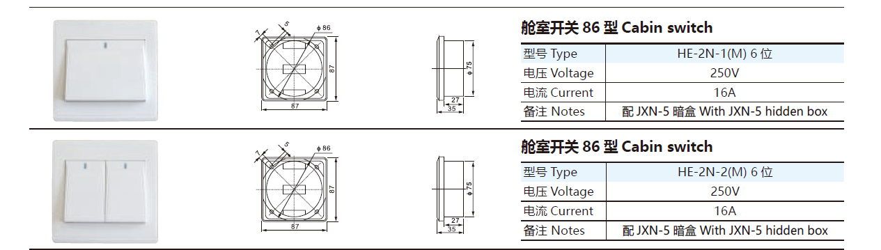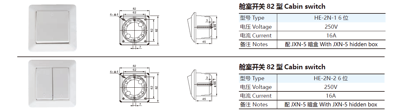 Marine Cabin Switch Surface Type 250V/16A | HE-2N-2M