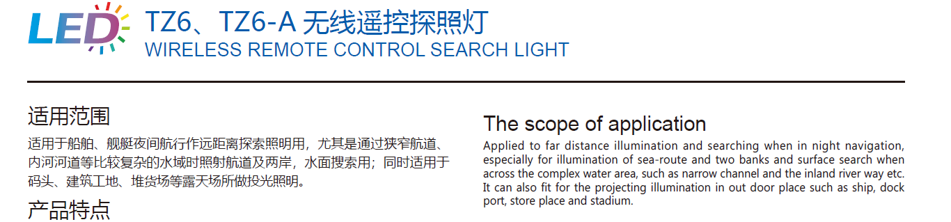 Application: Can be as a searchlight for night navitgation, especially for acrossing long-narrow cannel or complex water area; also can be as a flood light for outdoor illumination, such as dock, pork, store place ans stadium ect.