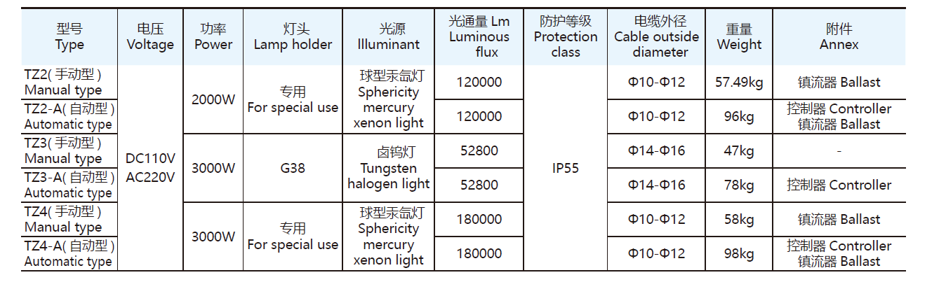 SUS304 Remote Control Searchlight Xenon 2000W | TZ2-A