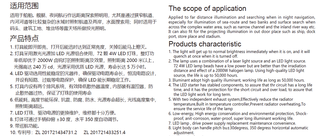 Application: Can be as a searchlight for night navitgation, especially for acrossing long-narrow cannel or complex water area; also can be as a flood light for outdoor illumination, such as dock, pork, store place ans stadium ect.
