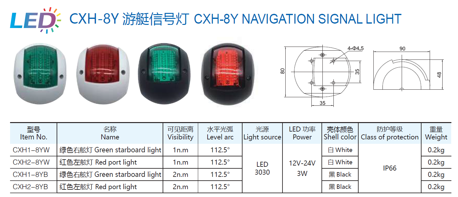 | CXH-8YB | Starboard Lights(Green), Port Light(Red) | 2n.m | 112.5° | Black | 3W | ||||